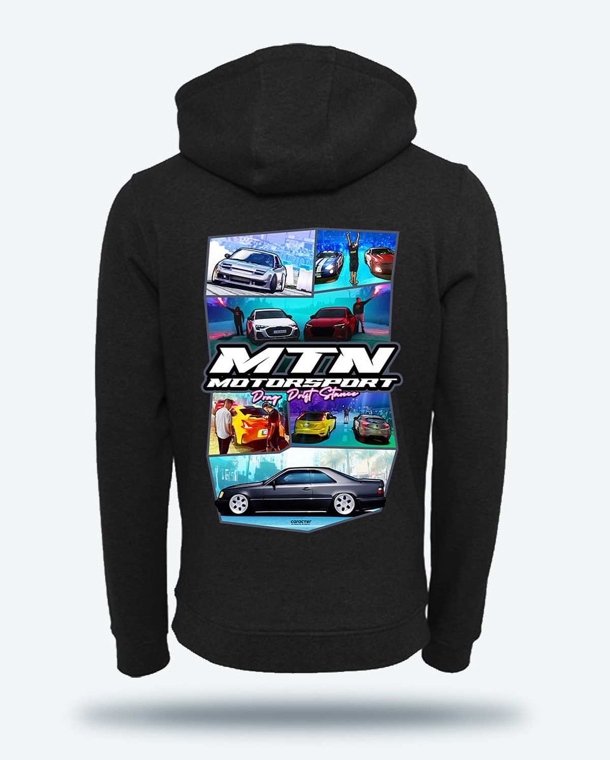Na przodzie bluzy umieszczono subtelne logo MTN Motorsport, natomiast tył zdobi duża, kolorowa grafika przedstawiająca sceny z driftu i street racingu, uzupełniona centralnym logo MTN Motorsport Całość tworzy unikalny, dynamiczny design, który wyróżnia bluzę nawet z dużej odległości.